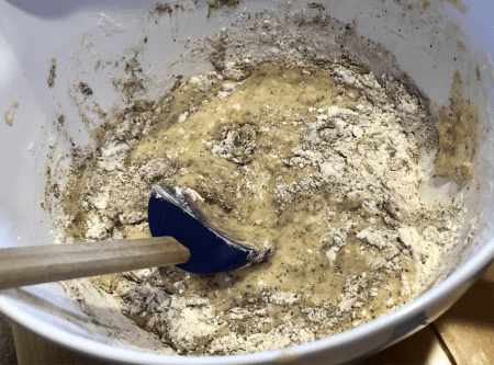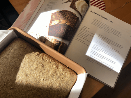 It is day two of our personal challenge to bake every cake in Yossy Arefy’s “Snacking Cakes.” We purchased a bag of buckwheat flour yesterday, along with the whole milk yogurt, just for today’s recipe-Buckwheat Banana Cake. And just like our first cake yesterday, the recipe was easy and came together quickly. I decided to weigh the flours today, but nothing else. Yeah, yeah, I know, I should either weigh everything, or measure everything for consistency, right? I might weight everything tomorrow, we’ll see how I feel. Anyway, the baking time for this cake is 35-45 minutes. Yesterday’s cake was the same and took 45 minutes. I assumed it might be the same today, but I was mistaken. This cake was done in 35 minutes, making me a little suspicious about our square pan size. I thought I purchased an 8″ pan yesterday, but I just measured it, and it is 9″. Sheesh, no wonder today’s cake was done so fast. Not sure why yesterday’s took the whole 45 minutes, bet it was done at 40, but I didn’t check it. So, ordering a new pan today, and may use a loaf pan until it gets here. Or a round pan. Or might just use the 9″ pan and start checking the cakes sooner. We’ll figure it out. Anyway, the Buckwheat Banana Cake turned out quite nicely. It’s not very sweet, making it a great candidate for the “Dress It Up” option included with the recipe, which says, “Serve warm slices of cake with scoops of vanilla ice cream and warm Whiskey Caramel (page 126) drizzled over the top.” Since we have all the ingredients on hand, we made the caramel, but skipped the ice cream, since we didn’t have that. But the caramel was more than enough to make this cake spectacularly delicious! Another winner in our book! We’ll be making this one again.