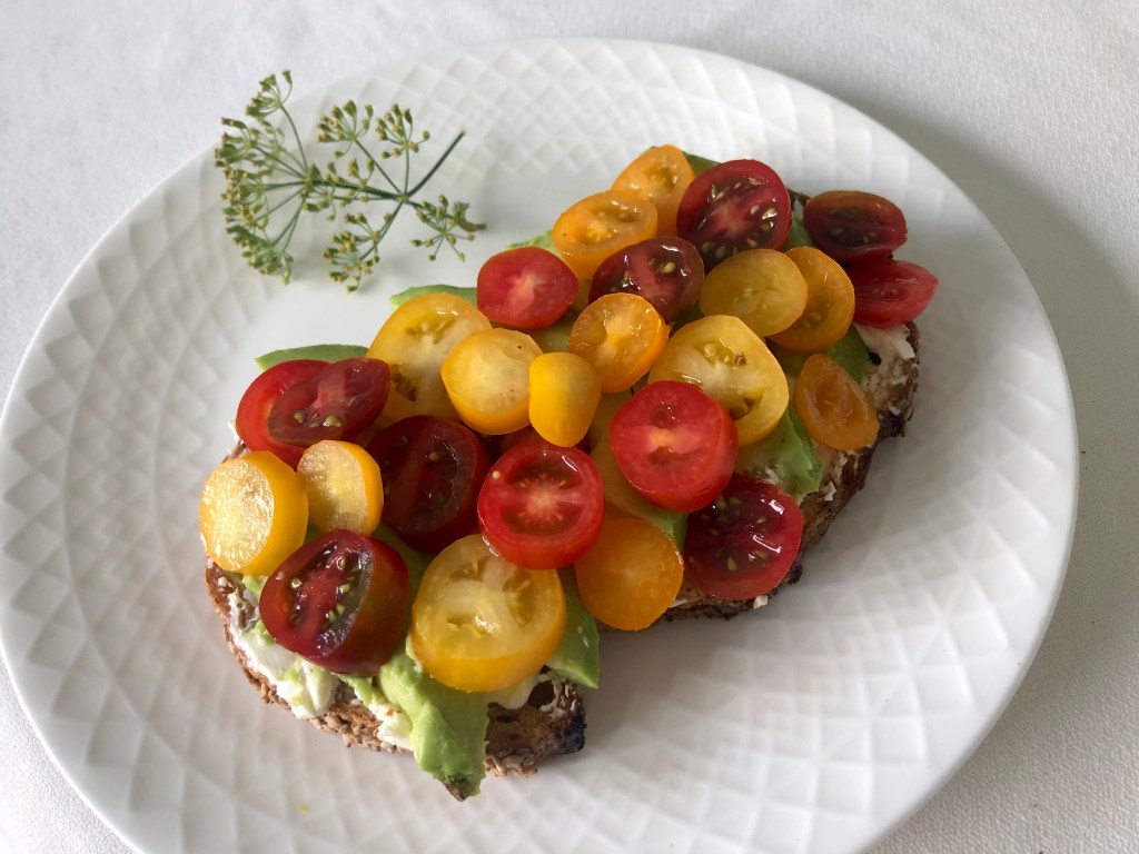 Breakfast today was vegetarian avocado toast. Vegetarian since it has no egg or meat. I know there are many avocado toast memes, but avocado toast is really delicious, if you love avocado, which I do. It starts with a slice of toast, I had sesame peasant from Common Good, a local bakery we love. Next, a slather of cream cheese. You could add fresh or dried herbs, garlic, fresh or powdered, and/or other spices if you wanted, but I kept it simple today. A generous amount of sliced avocado is layered on top of the cream cheese, followed by a rainbow of sliced cherry tomatoes. I don’t have enough ready from the garden yet, so I used some from my two pound mix from Costco. I actually bought them for savory tomato cobbler, a recipe I love from my SoNo Baking Company cookbook. but I might have enough in the garden tomorrow to replace what I used today. A little salt and hot sauce, if you like, and you have an amazingly yummy breakfast. If I ordered this at a restaurant, it would be $8, at least. $12 with an egg on top. I wish I’d made my own bread for this, but I’m working on it. My son is sending me some sourdough starter and I’ll be attempting sourdough bread in a few weeks. I’ll let you know how it goes. Heading to the Interlochen Farmers Market soon and then on to Hall’s, the sweet corn is ready! Some of the best sweet corn in the state. Hope they’re not sold out!
