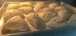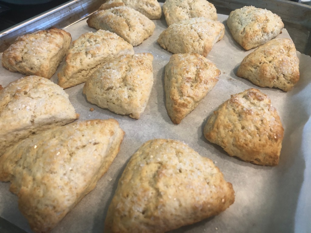 Besides having corn for breakfast, I made cream tea scones this morning. My go to recipe these days is from King Arthur Flour (KAF). It is super simple and they always turn out beautifully. Easier than the recipes which call for cutting in cold/frozen butter. I’d like to try adding mix-ins, like chocolate chips and raspberry jammy bits (from KAF), but I think I have to add them with the flour, before adding in the cold heavy cream, however, I keep forgetting. (Once you add in the cream and start mixing, there just doesn’t seem a good time to add mix-ins.) I top them with the sparkling sugar I also purchased from KAF, which adds a pretty finish and a nice crunch. While the recipe suggests chilling the baking sheet with the cut out scones for 15 minutes before baking, I’ve tried this before and I actually got a better rise just putting them into the preheated oven without chilling. I might try it one more time and see if I just botched it the first time. Anyway, they came out beautifully, again, so we’ll have scones here for a few days to eat with some leftover lemon curd I made last week, using a recipe from Sally’s Baking Recipes (previously Sally’s Baking Addiction, much cuter name, imho). Lemon curd is really easy to make at home, try it if you haven’t. Next time I make it, I’ll share the details. Now I need to start thinking about what to make for dinner…