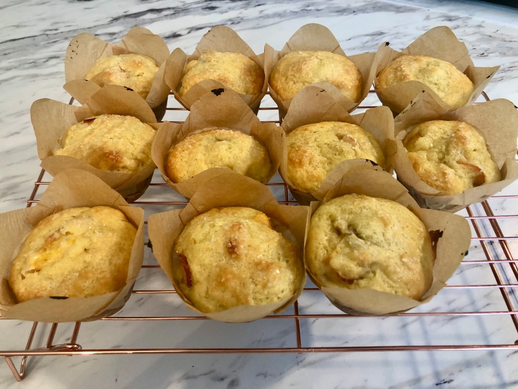 I also made Peach Muffins yesterday, before the zucchini bread. I used the Perfect Plum Muffins recipe from Christina’s Cucina blog. I’ve made this recipe before using plums and loved it, so decided to try it with peaches. She has a peach muffin recipe available, but I just stuck with the plum recipe, since she suggests using other fruits instead of plums, including peaches, if that is what you have on hand. It’s an interesting recipe, which calls for yogurt and olive oil, no butter. The muffins are so tender and moist, if you don’t overbake them (I did that once). I recently took a muffin class from a local chef, The Chef Lady, and learned all kinds of tips and tricks for making delicious muffins, regardless of the recipe. Like make sure all your ingredients are at room temp before you start. And let your muffin batter sit for 10-20 minutes before baking. Both of these tips will ensure a higher rise and fluffier muffin. I loved that class, I learned so much. Ended up buying some new baking equipment that has made baking so much easier and/or efficient. I’ll have some equipment posts in the future. Needless to say, the muffins turned out beautifully.