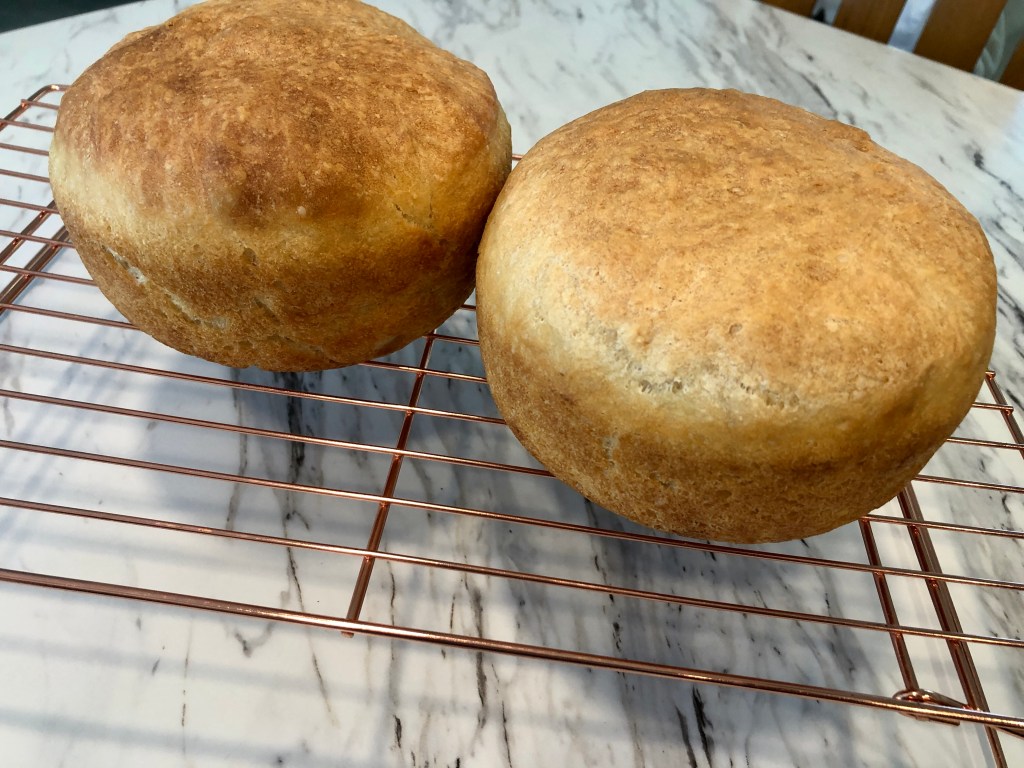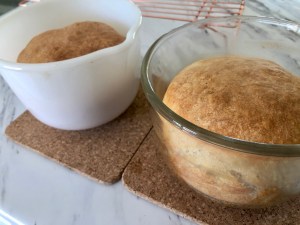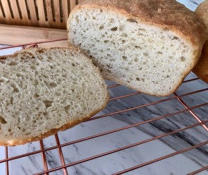 Bread Toast Crumbs, by Alexandra Stafford, is one of my favorite cookbooks. Her Peasant Bread recipe alone is worth the price of the book. It truly is a no-knead recipe (no sticky hands), that makes a delicious and versatile bread. You don’t even need to use a better for bread type flour, just regular multi-purpose flour. I first heard about this recipe while listening to Margaret Roach’s, “A Way to Garden” podcast. She was interviewing Alexandra about her book and I was so intrigued, I decided to order the book. The recipes are easy to follow and full of tips and tricks for success, so helpful. The only thing that some might find a bit challenging is acquiring two of the 1.5 pint vintage Pyrex 441 bowls, which the author says produce a beautifully rounded boule. Even though she says for best results to use two 1 quart Pyrex bowls, which are readily available and affordable online and in shops, her following statement about the vintage Pyrex results just makes you want those bowls. Of course the vintage bowls are so collectible and hot right now, finding one, let alone two, which won’t break the bank, will be a challenge. Maybe you or a relative already own one or two, and are willing to use them for baking? If they’re on display in your house, that’s another thing. I actually bought two glass bowls that I think went to old mixers. They are on the thick side, like Pyrex, but are not Pyrex. One says “Glassbake for Sunbeam” on the bottom. The other only has some small markings, which tell me nothing. They are basically the same size and I get beautiful boules out of them. So if you can’t find or swing the vintage Pyrex and don’t want to buy the simple clear modern bowls, you can always keep your eyes peeled for these. I actually found them at thrift stores for just a couple bucks.