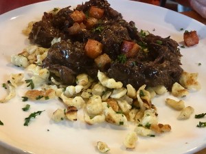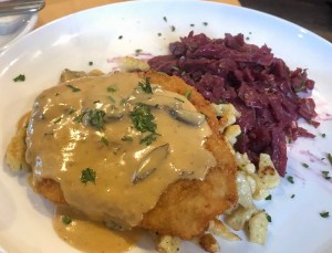 Once we checked into our motel in Marquette, we went to dinner at Steinhaus, a new German restaurant we hadn’t tried. My husband is almost 100% German, born in the USA. And…his grandfather owned a German restaurant in New York, way back when, where his father worked and learned to cook German food. This makes us really fussy about German food, though we are willing to try almost any German restaurant we stumble upon, since we love it. To our surprise and delight, it was some of the best German food we’ve had to date. My hubby had the Sauerbraten with spaetzle (little dumplings), while the rest of us had the pork Schnitzel with spaetzle and red cabbage. It was outstanding. We also had dessert, which was delicious, just not traditional German fare. We were just sad that we won’t be able to have it again until we are back in Marquette (or until I make it). After dinner, we went to see Joe do his thing.